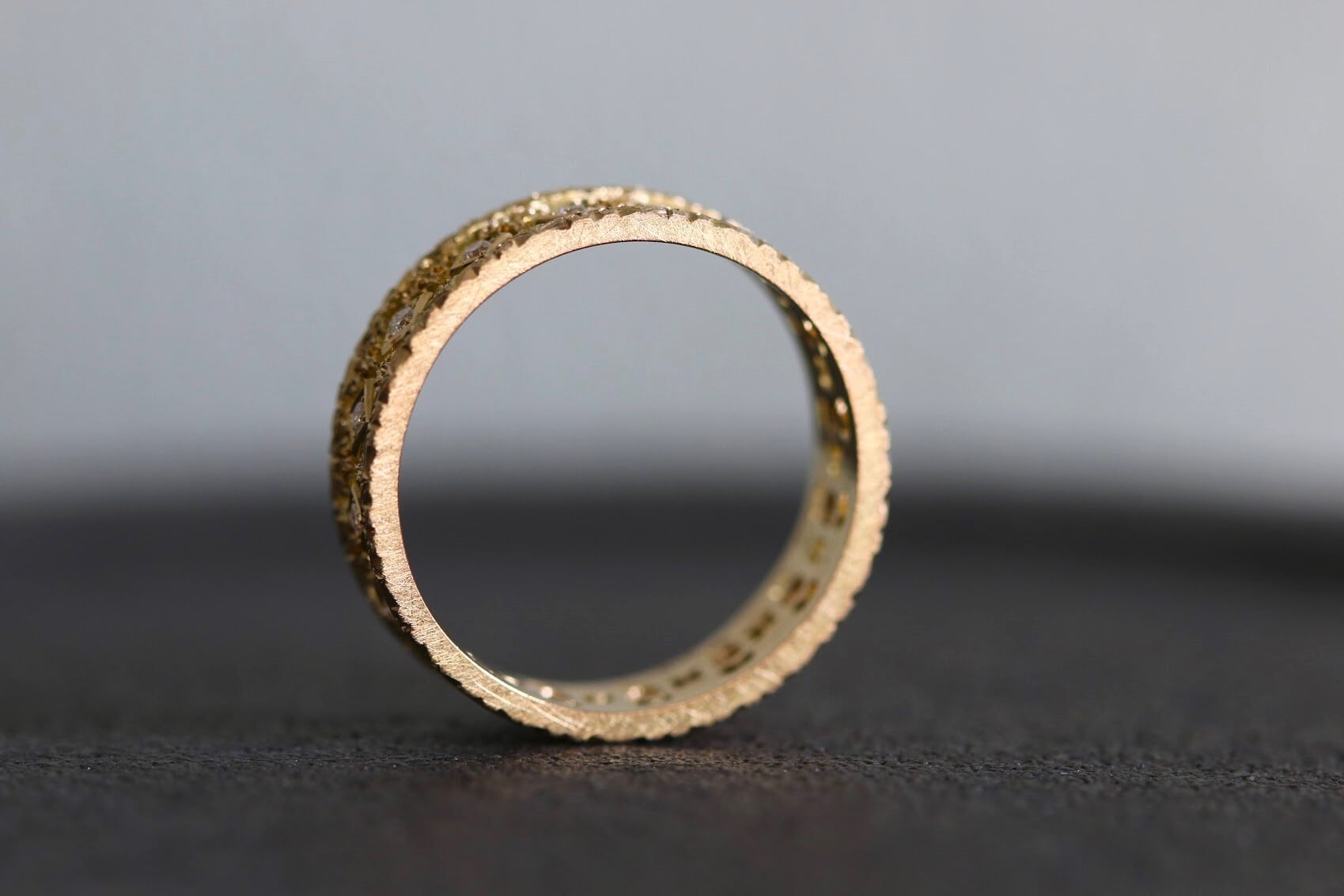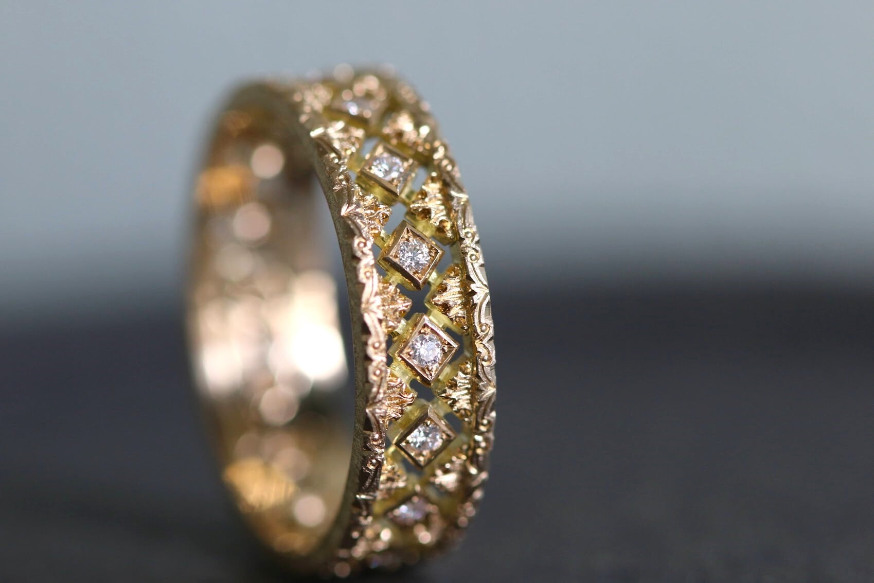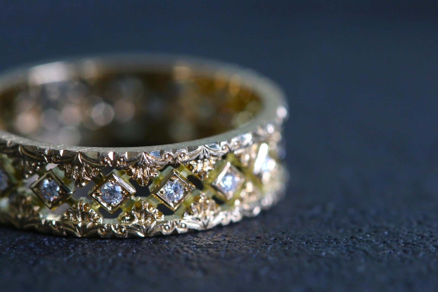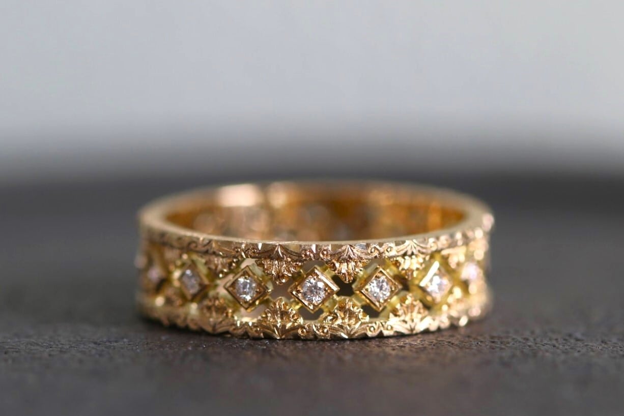 手で一つひとつ透かし、彫り込んだ緻密な細工を存分に楽しめるリングです。